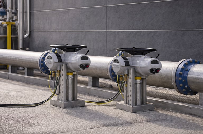 Montagem de atuadores em válvulas manuais com integração em sistemas de controlo industrial.