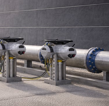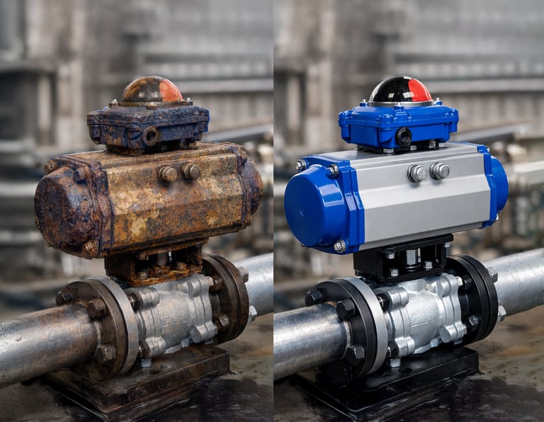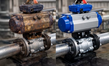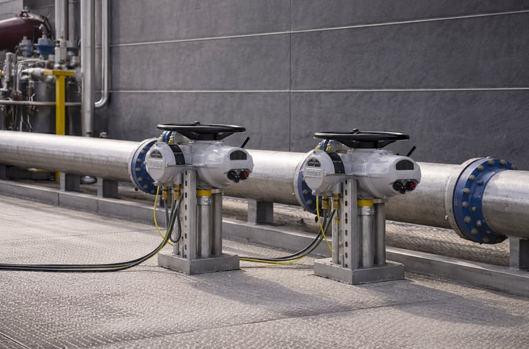 Montagem de atuadores em válvulas manuais com integração em sistemas de controlo industrial.